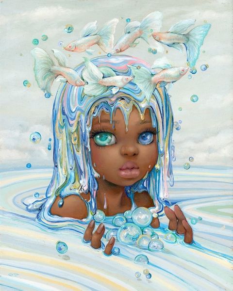 Curator: Camilla d'Errico's acrylic on canvas piece, "Nocturna," created in 2020, strikes me with its blend of the figurative, the surreal, and elements of pop art. What are your immediate observations? Editor: The smoothness of the painting grabs my attention, the flawless blending. It's visually magnetic, but what is that on her head? It’s an almost Disney-esque take on something darker... an unsettling quality, even. Curator: Absolutely, it embodies what some call 'pop-surrealism'. I see that crown of sea life atop her head as symbolic. In many indigenous water myths, there’s a figure that connects humanity and the ocean. This piece feels like a 21st-century iteration of those powerful archetypes. The work is also representative of a modern ideal that the ocean faces threats in late-stage capitalism due to the pollution it faces. Editor: You see symbolism; I see semiotics. The colours create a visual language here: the intense blues contrasted with the character's skin and the vivid, though oddly vacant, stares of the fish—they produce a fascinating system. Are the creatures extensions of her psyche or decorations for our amusement? Or are they both, caught in the structural elements of line and form? Curator: It prompts us to question beauty standards, too. D’Errico challenges conventions, portraying non-white figures in otherworldly contexts, disrupting colonial narratives inherent to mermaid tropes, for example. Her placement amidst a seascape is about reclaiming mythic power. It becomes more than just visual aesthetics, you see. Editor: Well, the interplay between realism and fantasy destabilizes conventional notions, indeed, even on a formal level. We have almost photorealistic qualities clashing with an idealized, doll-like figure that exists seemingly nowhere, and therefore everywhere, at once. Curator: Ultimately, it's this intersectionality that compels me – D'Errico crafts something that transcends style. She offers social commentary, challenging norms while pushing boundaries of art itself, creating a visual experience ripe for interpretation and discourse. Editor: I can appreciate that it exists both inside and outside set definitions and frameworks, resisting categorization in a productive and rather satisfying way.