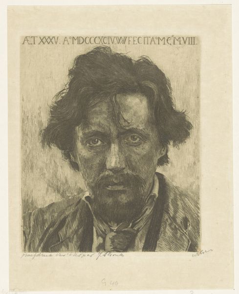 Editor: Here we have Ernst Ludwig Kirchner’s "Bildnis Professor Enrico Padua," an etching from 1923. The portrait is quite stark, the lines are really expressive and give it a somewhat melancholic mood. What do you see in this piece? Curator: It’s striking how Kirchner uses line to convey not just Padua’s likeness, but also a certain psychological intensity. The work exists within a context of societal upheaval in post-World War I Germany, and Kirchner, as an expressionist, seems to be capturing that feeling of disillusionment and alienation. Note how the angular lines almost dissect the professor's face. Do you feel this adds to the mood you perceived? Editor: Absolutely. There’s a tension between the detail in his face and the almost fragmented background. Is that tension part of what makes it Expressionist? Curator: In part, yes. Expressionism, especially in the work of Die Brücke artists like Kirchner, sought to portray subjective experience over objective reality. The fragmented background could symbolize the instability and uncertainty of the time, and Padua, though a professor, becomes a figure trapped in it. Look at the shadow on his face; how does that enhance your understanding? Editor: It makes him seem burdened, maybe even complicit. Almost as if he's reflecting on the role intellectuals play in society. Curator: Exactly! It pushes us to consider the individual within the larger historical forces. Art isn’t created in a vacuum, and expressionism is especially potent when considering social commentary. Editor: That’s given me so much to think about. Thank you. Curator: And thank you for your observations, that's why collaborative dialogues like this enrich how we understand artworks.