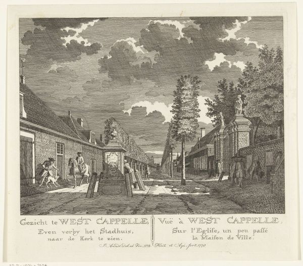 Hendrik de Leth created this print of the estate of Huis ter Meer in Maarssen with etching. The overall impression is one of ordered serenity, evoked by the formal arrangement of space and the use of linear perspective. De Leth employs a symmetrical composition, leading the eye along a central axis into the depths of the estate. This structured approach divides the landscape into distinct zones, each carefully detailed with buildings, figures, and meticulously arranged greenery. The use of line creates a sense of depth, but it also reinforces a controlled, almost geometric interpretation of nature. The architecture and landscaping reflect a formal aesthetic. The buildings, with their clean lines and balanced proportions, mirror the carefully shaped trees and hedges. Here, nature is tamed and ordered, reflecting a broader cultural desire to impose structure onto the natural world. Notice how De Leth's structured composition invites us to consider the semiotic interplay between nature and culture. The print serves as a cultural document, reflecting the values of order, control, and aesthetic refinement.