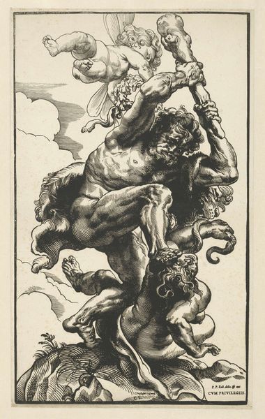 Curator: Looking at this engraving, we see Peter Paul Rubens’ composition titled "Hercules Overcomes Envy." Editor: It strikes me as a flurry of tension—a mass of bodies struggling. The texture achieved through the engraving is incredible; you can almost feel the strain in their muscles. Curator: Absolutely. Hercules stands tall, a beacon of virtue, wielding his club to vanquish Envy—that figure writhing beneath him, surrounded by snakes. Note how Rubens, versed in classical allegory, uses Envy's grotesque appearance to denote its repulsiveness. Editor: I am also intrigued by the cherub floating above—representing, perhaps, triumph? How did engravings like this circulate? They were more than just images. Curator: Prints played a crucial role. Engravings like this democratized art; knowledge circulated to a much wider audience than monumental canvases ever could reach. Rubens prints allowed workshops access to details on anatomy and composition for practical and instructive purposes. They shaped aesthetics and ideas through repeated distribution and reprinting. Editor: That makes it more engaging, thinking about how many hands may have reproduced each detail, translating meaning from one medium to another in a time before photographs. Curator: Indeed. And looking at the broader context, Baroque art often utilizes dramatic contrasts—evident here—to evoke emotion. Rubens masterfully utilizes visual symbols loaded with historical and cultural resonance. Editor: This work reveals the social agency embedded in accessible media. These prints offered a space for creative dialogue to flow as they replicated and interpreted masterworks. Curator: It’s been a fruitful reflection. To think that "Hercules Overcomes Envy" could incite discourse and influence artists across continents—powerful for an engraving. Editor: A final note to appreciate art history where consumption and process work together to produce an enduring symbol!