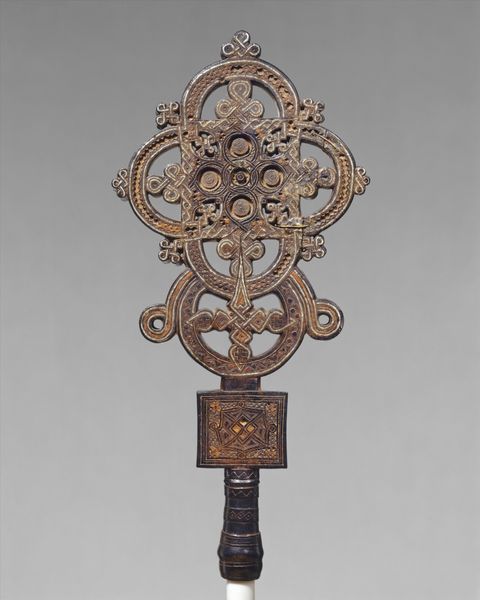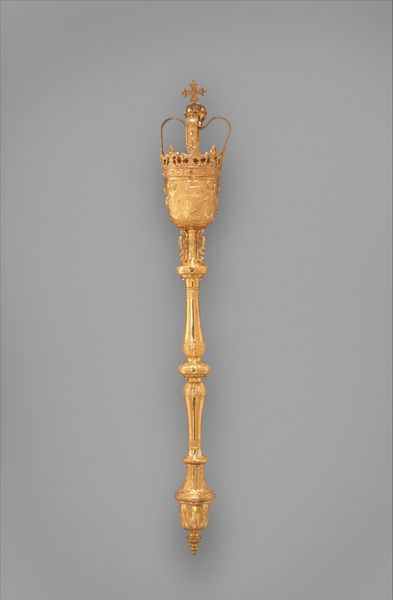 Curator: I see power. Opulence, even. What’s this glittering thing, a scepter perhaps? Editor: Not quite. What we have here is a smallsword with scabbard, crafted around 1773-1774, currently residing here at the Metropolitan Museum of Art. Its maker is listed as Master GG. Predominantly metal and gold, it represents more than just weaponry. Curator: Oh, "smallsword," so it’s deadly but petite. Look at that hilt, practically dripping gold! It's almost cartoonish in its excessiveness, like a prop from some opera about a ridiculously wealthy villain. Editor: The craftsmanship signifies its context. These weren't tools for battle anymore, but declarations of status, potent signifiers during the twilight of the ancien régime. Think about the class structures, the inequality... each glint of gold almost feels like a taunt. Curator: Taunt is an interesting word. It DOES scream arrogance. Did people actually wear this? Did they like…duel with it? Editor: Primarily ceremonial, though capable of being used in a duel, yes. Think of it as elaborate jewelry, reflecting the Baroque period's extravagance. What statements were they trying to make? Who were they trying to intimidate? Curator: Right. Intimidation. You're not exactly going to charge into a revolution wielding something that delicate, are you? This smallsword speaks of a world teetering on the edge. So many other possible futures where these weapons simply…vanished. And, I can’t lie, I kind of love it for that reason. Editor: It's a relic, not just of craftsmanship but of a complex societal tapestry. Examining it now lets us explore ideas about precarity, power and social identity through an intersectional lens. Curator: Exactly! It’s history distilled into shimmering metal and now transformed into something beautiful and dangerous. I love how a "useless" object like this can show us so much.
