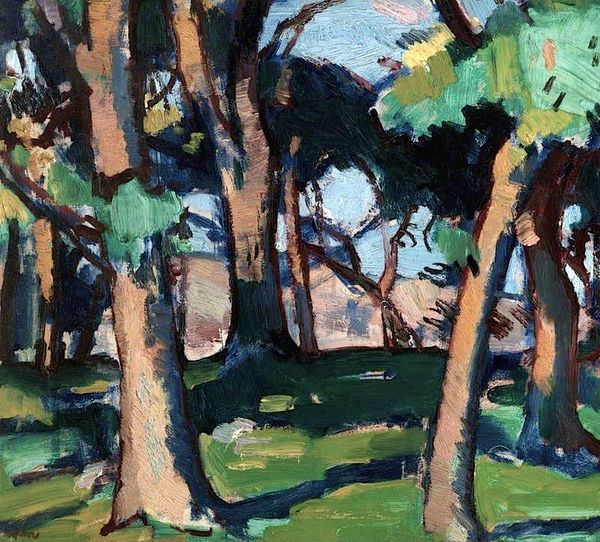 Henri Matisse made this "Corsican Landscape" painting using oil paint on canvas. These are traditional art materials, of course, yet how Matisse applied them is anything but traditional. The painting is made of visible brushstrokes, each one a record of the artist's hand moving across the canvas. The colors are intense and not directly representational; note how the ground plane is evoked with strokes of yellow and the sky with vibrant blue and white daubs. This way of working prioritizes the artist's direct experience and sensory impressions over realistic depiction. It is a painterly approach, one that celebrates the materiality of the medium itself. Matisse's direct manner of painting emphasizes individual expression and challenges the prevailing academic style of his time. Instead, he focused on the pleasures of looking, and of marking the surface with paint. In this regard, he shares common ground with many makers in the field of craft, where process and material sensibility are prized.
