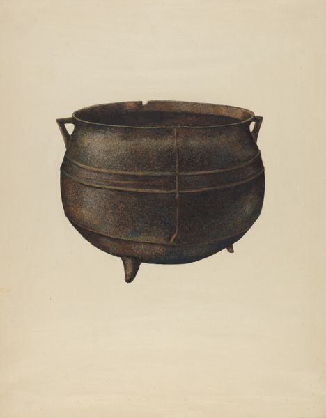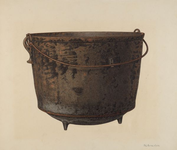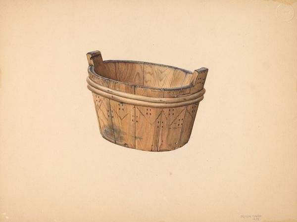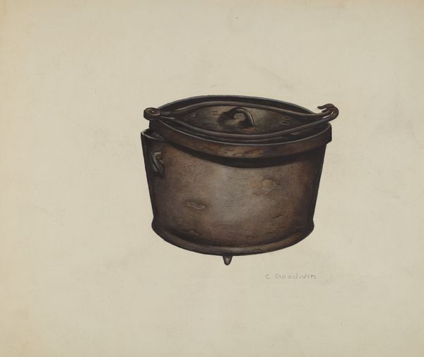 Curator: Oh, my, it’s almost hauntingly beautiful, isn’t it? It’s so subdued, like a memory fading. Editor: Well said. Here we have "Sugar Pail with Cover," a watercolor and colored pencil drawing by Erwin Stenzel, created in 1939. At first glance, it presents as a rather unassuming still life of a humble, everyday object. Curator: Everyday is precisely the magic of it! The worn paint, the visible age—it tells a story without saying a word. I find myself wondering about the hands that held it, the kitchens it sat in, all the sweet moments it witnessed. Editor: Precisely! The pail speaks to utility. The marks on the cover remind me of layers and the means of production of everyday aesthetics, even the use of paint—likely a lead paint, typical for that period—suggests a narrative of labor and available materials. The imperfections aren't flaws; they're records of interaction and use. Curator: Yes! Like wrinkles on an old friend’s face. It transforms a mundane item into something deeply human. Did you also notice how meticulously he captured the textures? It's almost photographic in its realism. I think of the Pre-Raphaelites… the obsessive details! Editor: Absolutely. Stenzel pays incredibly close attention to replicating visual detail. You know, a "sugar pail" wasn't just about sugar, though. It likely contained other precious commodities. This raises questions of what value means and how ordinary people made do during the late 30s with folk art traditions. Curator: So it's not *just* about sugar, it's about the sweetness we find even in difficult times? I like that even more. Editor: It invites us to contemplate labor, the materials used, and how they connect with economic realities. And of course the sugar. Curator: I suppose that's a useful reminder, even now. Something about seeing beauty in the ordinary, the well-used, it reframes the way you see everything. Editor: Yes, considering its context—it encourages us to be more thoughtful about what and how we consume!