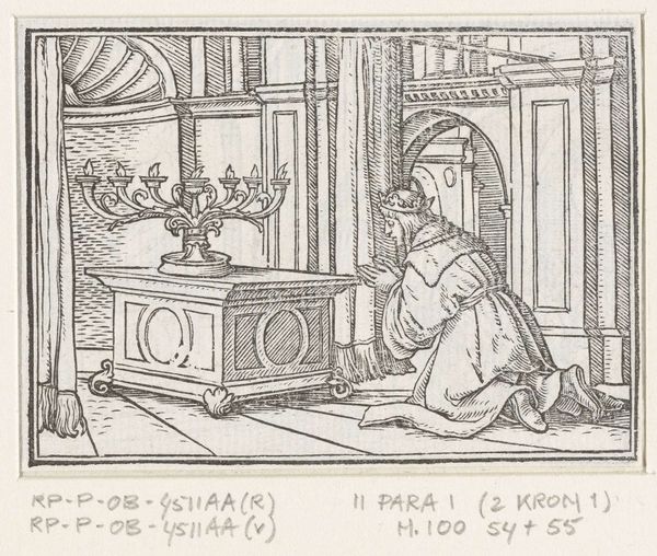 Curator: Hans Holbein the Younger created this woodcut, "2 Chron. I". It depicts a kneeling figure before a menorah. Editor: My first impression is somber. The stark lines and the figure in prayer evoke a sense of solemnity. Curator: Holbein's work often reflects the political and religious tensions of his time. The setting, possibly representing Solomon's Temple, would have had significant resonance amid Reformation debates. Editor: Absolutely, the menorah itself becomes a potent symbol. Light, knowledge, divine presence—it speaks to a deeper yearning for spiritual guidance. Curator: Considering the historical context, it's tempting to view this image through the lens of power dynamics. Who is allowed to interpret these symbols and for whose benefit? Editor: I agree. This piece reveals the enduring power of visual symbolism to carry memory and shape cultural identity, even across centuries. Curator: It's a reminder that these images aren't static; they continue to evolve and challenge our understanding of the past and present. Editor: Precisely. Seeing the layers of symbolism enriches our experience of the piece.