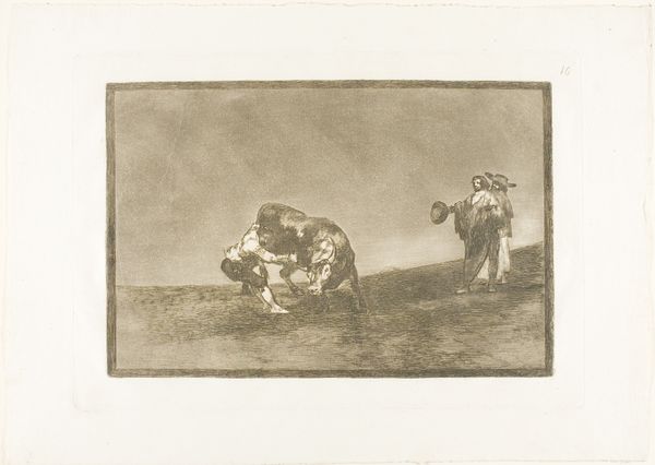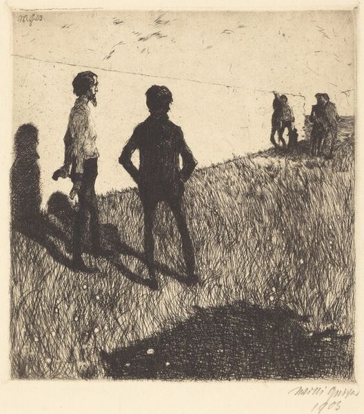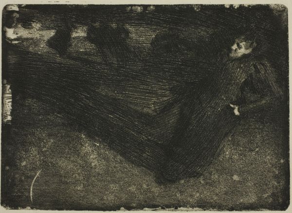 Editor: Here we have Georges Seurat’s “Peasants,” made with charcoal sometime between 1881 and 1884. It’s a landscape dominated by dark, textured strokes, and it feels incredibly somber. What aspects of the artwork stand out to you? Curator: The overt darkness itself is crucial. Seurat uses charcoal to emphasize the grueling physical reality of agricultural labor. We see the 'means of production'--these peasants are practically fused to the earth and their tools. Consider the very *material* of the charcoal; it comes from burnt wood, hinting at transformation and perhaps even sacrifice tied to labor. Editor: Sacrifice? How so? Curator: Well, look at the technique. It's not a smooth, idealized portrayal of rural life, but rather built up from countless individual marks, representing each moment of toiling in the field. It seems as though the material is not so different than the bodies portrayed: transformed by toil and rendered almost shapeless in its wake. What were the material conditions for peasants in the 1880s? This piece reflects the consumption of their lives in the act of production. Editor: So you're saying Seurat is less interested in depicting pretty scenery and more focused on showing the harsh economic realities? Curator: Precisely. It pushes against romantic notions of the countryside and instead, highlights the relentless demands on their bodies and labor. This is about the process, the material world of labor and class. Editor: That's given me a whole new perspective on the piece. I initially only saw darkness and a landscape. Curator: And that's valid! But through a materialist lens, we can better appreciate how Seurat elevated a common medium into an expression of the social and economic environment in 19th-century rural France. Editor: I'll definitely look at art through this lens going forward; thinking about the "stuff" behind the art adds more complexity.