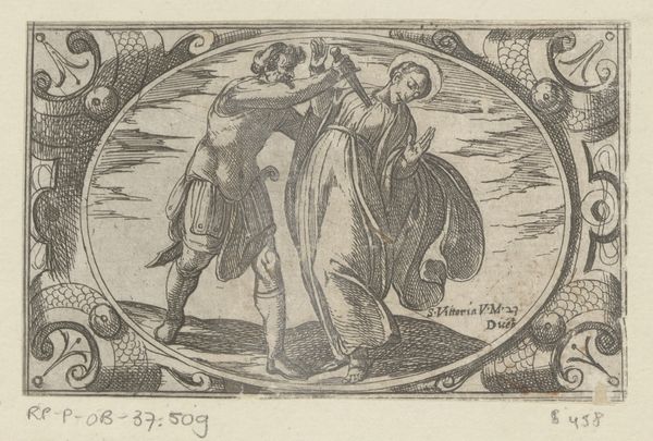 Antonio Tempesta created this engraving of Saint Columba and Saint Mustiola, a work brimming with symbols of martyrdom and faith. Observe Columba kneeling before a bear, a symbol of her triumph over primal instincts through piety. This motif echoes the ancient theme of taming the wild, a recurring image that reflects humanity's struggle to control inner chaos, seen even in depictions of Daniel in the lion's den. In the center, Mustiola stands bound, ready to be stoned – a stark image of sacrifice. The stone, often a symbol of foundation, here becomes an instrument of death. To the right, a man stands poised to execute Mustiola, a sickle raised high. Consider the sickle – an agricultural tool turned weapon, representing the cycle of life and death. This transformation is potent, resonating with the psychological tension between creation and destruction. Such symbols are not static; they evolve, carrying layers of meaning across epochs. Like echoes in a vast chamber, these images reverberate through history, their forms shifting, yet their essence enduring.
