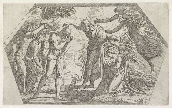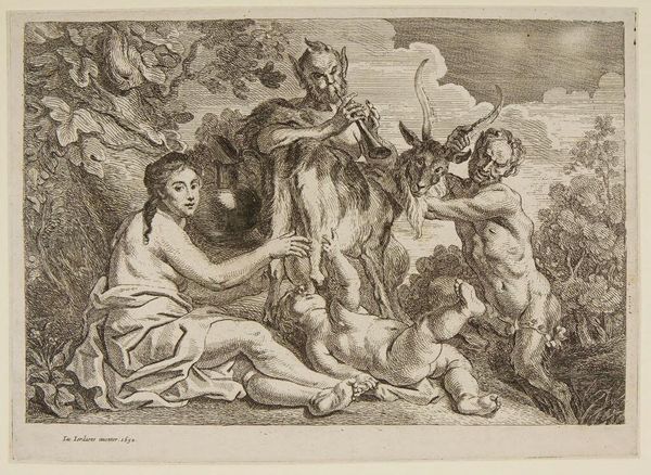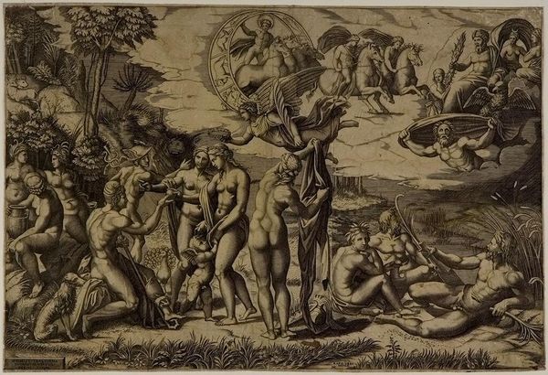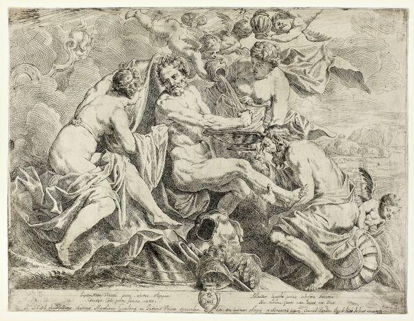 Curator: This engraving is entitled "Justice, Peace and Plenty," made by Rombout Eynhoudts, a Flemish artist born in 1613. It presents a complex allegorical scene. Editor: Wow, it feels like a Baroque fever dream! There's so much happening. Chaos and serenity coexisting… quite a contrast! Curator: Indeed. The work depicts Justice and Peace in close embrace, while putti frolic amidst symbols of abundance, a direct contrast to the defeated figures representing war. We need to consider the historical context of the Thirty Years' War, and how artists then sought to highlight such restorative values. Editor: Absolutely. Looking at it now, beyond the visual overload, there’s a yearning for harmony. Maybe that's why it still resonates today, this very human need for balance. Curator: It's a powerful reminder that these ideals are perpetually intertwined, perpetually sought, and the sociopolitical messages of the past reverberate still in our present. Editor: Agreed. Makes me wonder, what do Justice, Peace, and Plenty really look like in practice? Perhaps it is something always imagined but never fully captured.