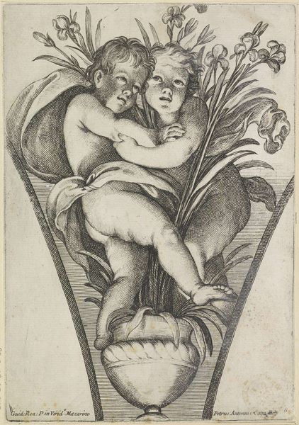 Curator: Here we have "Three Putti with Armour," an engraving crafted between 1525 and 1550 by Sebald Beham, now residing at the Rijksmuseum. What strikes you initially? Editor: My first impression? These aren't exactly cherubic angels. There's a weightiness to their expressions, almost a sense of burdened seriousness, despite the chubby cheeks and playful armor. Curator: It’s a compelling tension. Beham, as part of the German Renaissance and Reformation, lived through immense social upheaval. This print appears during a time of challenging shifting views on children's innocence and potential inherent sin. How do we then portray children as symbols? Editor: Right, these aren’t your typical, innocent putti. The helmet and shield are classic symbols of power and defense. It almost hints at this notion of innocence already burdened, or perhaps co-opted, by the potential for earthly conflict. The symbolism asks, at what stage of development are we inducted into ideology? Curator: The socio-political implications here can not be dismissed. There’s a debate surrounding iconoclasm happening during Beham’s time. Are the putti stand-ins, proxies, for grander ideas, like, say, religious icons now stripped bare? What kind of political reading could you interpret, based on that reading? Editor: I find it incredibly provocative, in the face of the Reformation's views on corruption, this composition makes me think of an emerging sense of children shouldering cultural guilt, not inheriting simple innocence. It plays on earlier Renaissance ideas, subverting visual and philosophical idioms by giving new psychological textures. Curator: Absolutely, and that interpretation adds another layer to Beham’s visual commentary. Thank you for offering a fresh angle of analysis. Editor: It's a perspective built by visual semiotics. Seeing this now offers a new avenue of consideration on Reformation social anxieties and historical memory.
