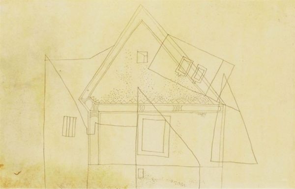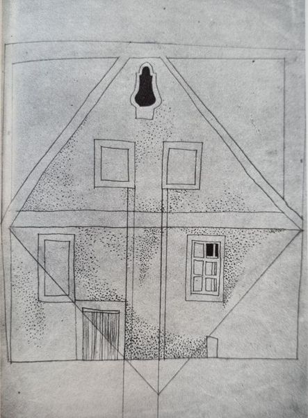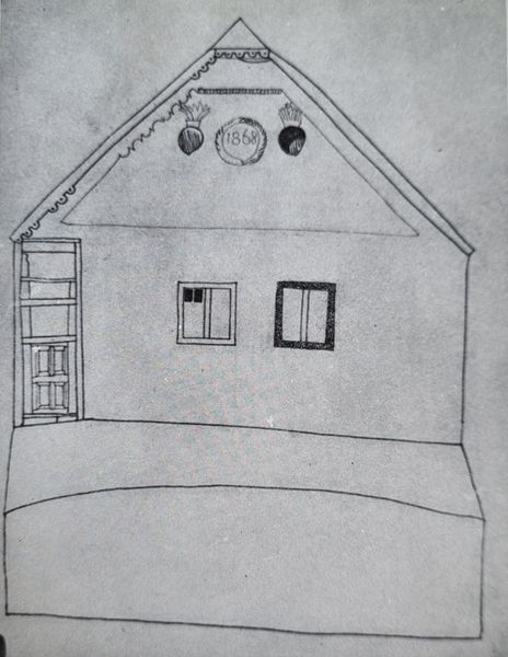 Curator: Lajos Vajda's pencil drawing, titled "Sziget Monostori Ház Hosszú Kerítéssel", captures a rather unassuming scene. My first reaction is one of geometric austerity—a basic gable roof structure combined with a rigidly patterned fence. There's a childlike quality in its simplicity, yet also a deliberate starkness. Editor: It does have a disarming effect, doesn't it? Vajda, although stylistically rooted in realism here, consistently mined folk art themes. This image almost presents an archetype of 'house'. Consider the symbolism of home; the protective fence a boundary between the self and the world. Are the details more revealing than the simplified structure? Curator: You're right. The geometry feels almost imposed, while those softer, hand-drawn inflections disrupt the facade. Look at the circles under the roof—a darkened orb next to the laurel wreath; odd. But note the triangular decoration just below the roof apex! A more chaotic patch than its stark container! Editor: Yes, that small triangle certainly invites our curiosity! It seems to suggest there's more here than meets the eye. What about the door beside the window? Framed by an arched opening! This seems too self-consciously classical. Curator: Perhaps referencing older architectural styles – echoing collective memory and heritage! This contrast speaks to the complexities hidden within ostensibly 'simple' lives and structures. Each element becomes a little echo, bouncing off the fence to confine our views. Editor: Do you believe there’s an underlying narrative or just playful compositional experimentation at work? Vajda juxtaposes flat planes with subtle, atmospheric textures. Is he striving for visual depth? Curator: It’s probably both. There is indeed a conscious flattening that pushes against realism's inherent illusionism while invoking a childlike visual grammar. He presents a simplified home as both symbol and form. The dark spots might represent anxieties within. Editor: Interesting. It's intriguing to think that within its plainness, the drawing subtly encourages an almost archetypal recognition of ‘home’ – and perhaps the tensions implicit within it. Curator: Precisely! The house, fence, decorative touches—a symbolic layering that gives weight to this seemingly straightforward composition. I'm glad we took time to appreciate the complexities in what appears to be simplicity itself.