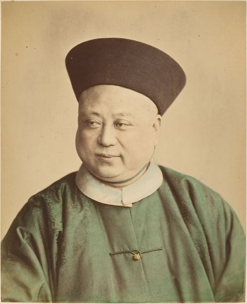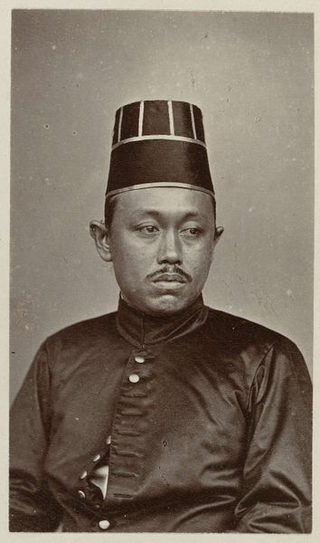 Editor: So this is Raimund von Stillfried's "Portret van een Chinese jongeman," taken sometime between 1860 and 1885. It's a photograph, and there's something about the sitter's direct gaze that really holds my attention. What stands out to you about it? Curator: For me, the compelling aspect lies in unpacking the layers of production. Consider the albumen print, the photographic process itself. This was cutting-edge technology in its time, a Western invention brought to bear on capturing a likeness from Qing Dynasty China. Think about the photographer’s studio, the labor involved in creating these images – from preparing the chemicals to posing the sitter. Editor: That's fascinating. It makes me consider how different photography was back then from now. How would you say the historical context affected the work? Curator: It’s impossible to separate this portrait from the context of colonial expansion and trade. Von Stillfried, a European photographer, is essentially documenting, and perhaps exoticizing, a subject within a system of unequal power dynamics. Who commissioned this work, and for what purpose? The photograph isn’t simply an objective representation but is tied into a market of image production, isn’t it? Editor: It’s true; there is no innocent eye. Considering that material exchange puts the work in a completely new light. What do you find particularly telling? Curator: Look closely at the man's clothing – the fabric, the buttons. What do these details tell us about his social standing and the economy of material goods at the time? Editor: It's clear there's so much more to this portrait than meets the eye. This has made me really think about the forces at play when this image was created. Curator: Precisely. By looking at the means of production and consumption we can move beyond surface appearances.