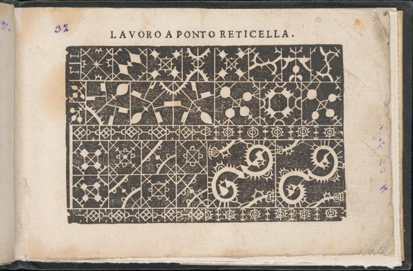 This is page 35 from *Studio delle virtuose Dame*, made by Isabella Catanea Parasole around 1600 using woodcut and letterpress. The immediate impression is one of structured complexity, created through a high-contrast pattern of geometric forms. Circles, squares, and rectangles interlock within a rigid grid, producing a visually compelling design. Parasole used a restricted visual vocabulary to explore the potential of pattern making. This work reflects a broader artistic and philosophical interest in the underlying structures that govern visual experience. The black ink and blocky shapes form a semiotic system, inviting us to decode the underlying order. The design seems to challenge any fixed, singular meaning, instead emphasizing repetition and variation. Ultimately, the strict geometric forms function not only aesthetically but also as part of a cultural discourse on beauty, order, and the mathematical underpinnings of design during the Renaissance. This artwork encourages ongoing interpretation and re-interpretation.
