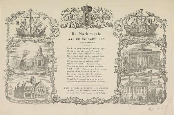 Friedrich Robert Prinz created this New Year's greeting card for the Amsterdam night watch in 1854, using the relatively new medium of lithography. This process allowed for the detailed reproduction of images and text, making it perfect for mass-produced items. The buildings depicted, rendered with sharp precision, likely represent important civic structures in Amsterdam. The overall effect is one of civic pride, with the text celebrating the role of the night watch in maintaining order. Lithography democratized image-making, taking it out of the hands of individual artists and putting it into a mode of industrial production. We can consider this print in relation to wider social issues of labor, politics, and consumption. The piece isn't simply a decorative object but also a document of its time, reflecting the industrialization of art and its connection to wider social systems.