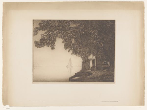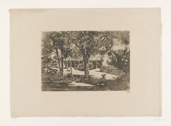 Simon Moulijn made this etching, 'Gezicht op de achterkant van Paleis het Loo,' and well, it's all about subtle tonal shifts, isn't it? It's kind of like the visual equivalent of a whisper, with this soft, sepia palette that feels both nostalgic and immediate. Look how he teases out the textures of the foliage, using a really delicate touch. There’s this big tree smack dab in the middle, and each of those lines describing it is like a little decision, a tiny map of the artist’s process. You can almost feel him there, squinting, choosing which branch to commit to the plate. I’m reminded a bit of Whistler, who also knew how to make something poetic and atmospheric out of the everyday. And like Whistler, Moulijn invites us to slow down, to really look, and find beauty in the understated.