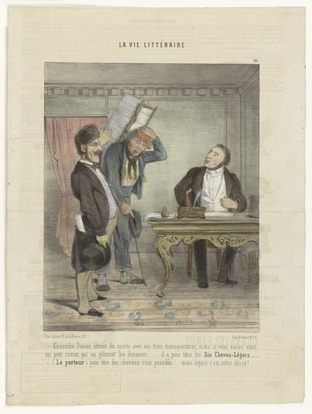 Editor: This is "Schuldeiser met schuldenaar," or "Creditor with Debtor," a pencil drawing by Paul Gavarni, dating back to 1846. It has a really interesting sketchy quality; it feels like we're seeing a private moment, but the figures are rendered almost comically. What can you tell me about what's going on here? Curator: Well, first observe the postures. What emotions do they convey through their body language? Do you see how the hunched posture of the debtor is a universal signifier for shame, powerlessness? Consider how this symbol plays out historically across cultures, in visual arts or performance? Editor: Definitely. He's sort of shrinking in on himself, looking down. The other man is standing upright, hands on his hips... very confident, or maybe even aggressive. Curator: Exactly. Gavarni employs well-worn symbols. Even the seemingly simple act of hands on hips becomes an assertion of authority. How might a contemporary audience have reacted to the contrast? Editor: Maybe they saw themselves reflected in one of the figures. It makes me wonder about wealth and power in Parisian society at the time, and maybe how relatable or controversial it would be. Curator: Indeed. Remember, caricatures use familiar symbols, exaggerating for emotional effect. Consider how it shapes our perception of historical attitudes towards wealth, debt, and the human cost between them. Editor: So, seeing familiar gestures gives the artwork more impact. I hadn’t thought about it like that before! Curator: Visual symbols connect us to the past. Through understanding them we recognise that emotions around cultural objects or artworks echo through time and generations, shaping not only our understanding but even the collective subconscious.