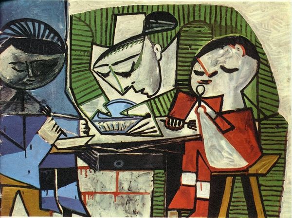 This version of Velázquez’s "Las Meninas" by Pablo Picasso uses oil paint, and probably canvas, to slice up and reassemble a masterpiece. The process feels intuitive, like sketching but with paint. The palette is high-key, contrasting flat areas of bold colors that vibrate against each other, creating an intense visual energy. Look at how Picasso uses black not as a shadow but as a shape, pushing the boundaries of form. The material qualities, like the thick paint application, give a tactile presence to the figures, emphasizing their deconstructed forms. Notice the rapid brushwork, the way he allows the strokes to remain visible, capturing the immediacy of the act. Take the small white dog, a simple form painted with such affection that it becomes one of the most tender details in the whole piece. This work reminds me of Philip Guston's later paintings, where figuration is re-imagined through a cartoonish yet deeply expressive style. It’s all about how painting can hold space for multiple interpretations, embracing a playful ambiguity that keeps us guessing.