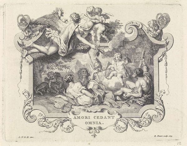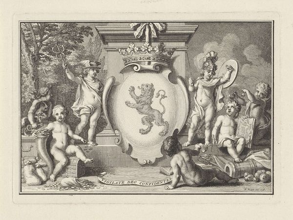 Editor: We’re looking at "Minerva and putti mourning at a tomb," an engraving by Jacob Houbraken, likely made between 1708 and 1780. The scene has a rather somber feel to it. What can you tell us about it? Curator: This print reflects the 18th-century obsession with classical themes and allegories, often used to convey moral or political messages. Observe how Minerva, goddess of wisdom and strategic warfare, is depicted not in triumph, but grieving. This signals a lament for lost intellect or perhaps a fallen leader. The putti, cherubic figures, reinforce the theme of mourning, but also speak to innocence and the vulnerability of knowledge in the face of destructive forces. How might the location of the print, within the walls of the Rijksmuseum, affect its viewing? Editor: That’s fascinating. I hadn't considered the political undertones. Is it typical for art of this period to use mythological figures to comment on contemporary events? Curator: Absolutely. In the absence of direct political critique, allegory served as a powerful tool. Moreover, the patronage system played a key role. Wealthy individuals or institutions commissioned works that subtly supported their views. Is it possible this piece mourns for a specific influential figure within their academic or political circles, someone perceived to embody wisdom now lost? Editor: I suppose so. What do you find most compelling about the visual composition of this piece? Curator: Notice the framing device—a sort of proscenium arch. It pulls us into this idealized scene, reinforcing the idea of a staged narrative, meant for public consumption and reflection. Considering this intaglio was designed for reproduction, what public do you believe Houbraken was trying to reach? Editor: Maybe learned individuals of the period, those who appreciated classical references? I definitely hadn't initially considered that this might have been social commentary on intellectual or political loss. Thank you. Curator: And I had not paused to consider how the setting might transform how a present-day museum patron interprets Houbraken’s vision.