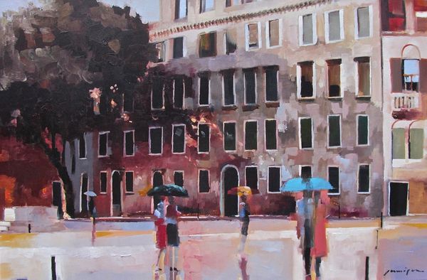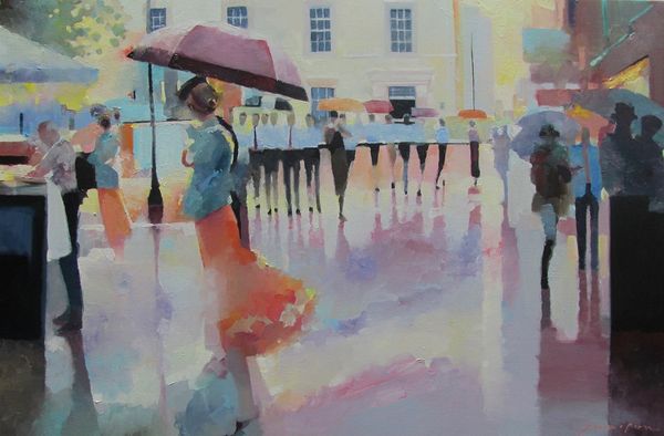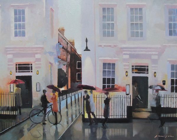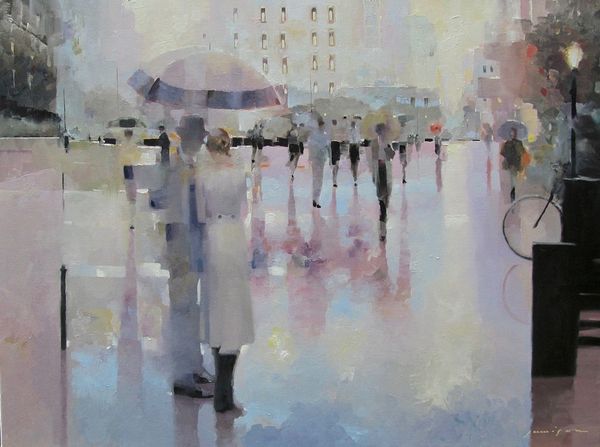 Editor: We're looking at "As You Do," a contemporary painting by Jeff Jamison. It feels very much like an urban snapshot. I’m struck by how the umbrellas seem to dot the canvas, punctuating the rather grey scene with little bursts of colour. What stands out to you about this work? Curator: What grabs my attention is how Jamison portrays public space. These figures with their umbrellas are navigating the very specific kind of public life that a rainy city fosters. This painting, in its realism, is depicting the street as a shared space shaped by weather, architecture, and, significantly, class. Editor: Class? Curator: Consider the architecture: uniform facades, wrought iron, very proper. It evokes a specific socio-economic milieu. Then observe the figures – their attire and purposeful stride suggest middle-class professionals going about their routines despite the rain. Think about who historically is afforded the protection and mobility within urban environments, and who isn't. Editor: So, it’s not just a cityscape, but a commentary on access and urban experience? The almost muted palette suddenly speaks volumes. Curator: Exactly! The "realism" isn’t just about accurate depiction. It’s a tool. The mundane details—the bicycle, the briefcases, the street lamp—all contribute to a very particular vision of urban life, one where privilege subtly dictates how one moves through and experiences the city. Do you see it now? Editor: Absolutely. I came in thinking about colour and composition, but I’m leaving thinking about the politics of a rainy day! Thank you for widening my perspective. Curator: It was my pleasure. Paying attention to the cultural and political contexts of art can reveal new layers of meaning within seemingly simple scenes.