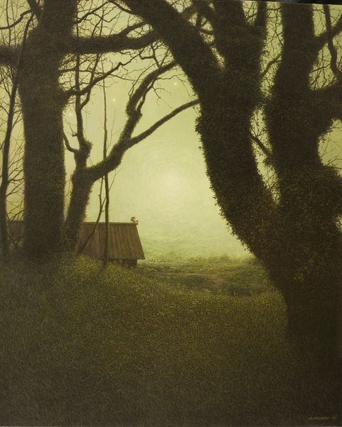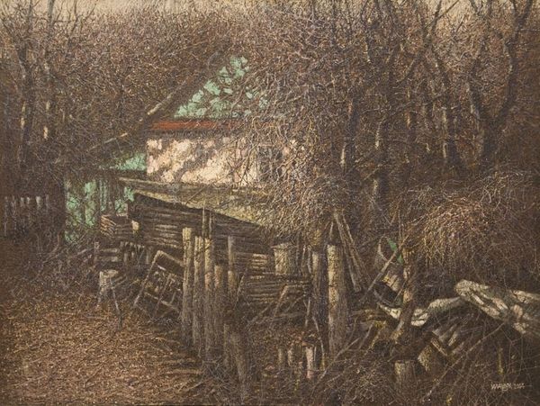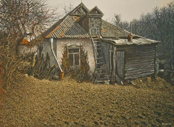 Ivan Marchuk created this painting called 'Trees' using a technique that brings forth a tactile reality. The painting is dominated by earth tones, with a dense layering of brushstrokes that mimic the textures of bark, grass, and aged wood. The composition directs us through a screen of trees and foliage to what appears to be an abandoned structure. Marchuk uses light to carve out shapes, giving the objects a striking three-dimensionality. The stark white of the building contrasts with the muted browns and greens of the natural elements, highlighting the geometry of decay against the organic chaos of nature. The structure’s shadow and the overgrowth of the land blurs the line between architecture and nature. This blurring raises questions about the impermanence of human constructions. The painting evokes a sense of temporal depth, reminding us of the continuous dialogue between human impact and natural reclamation.