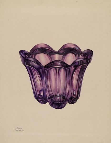 John Tarantino made this Finger Bowl, a watercolor, at some point during his very long life. The purple, it’s almost like a deep bruise, but one you want to touch, you know? It’s interesting how watercolor can be so immediate. Here, it's used with precision to show the curves and contours of the glass. See how the color pools in some areas, and washes out in others. And there are these dark outlines, like stained glass but softer. It’s like Tarantino is chasing the light as it moves through the glass. Look at the way he renders the base, it’s a tiny jewel! It reminds me a bit of Morandi's still lifes, where he’s exploring the beauty in the everyday object, finding something profound in something simple. It’s like he’s saying, ‘Hey, even a finger bowl can be a masterpiece.’
