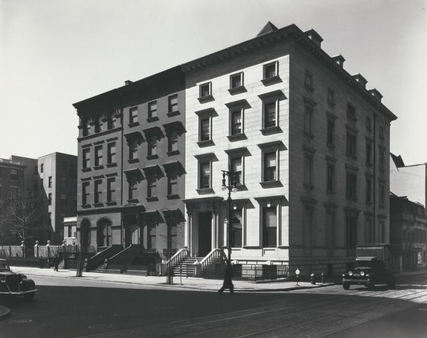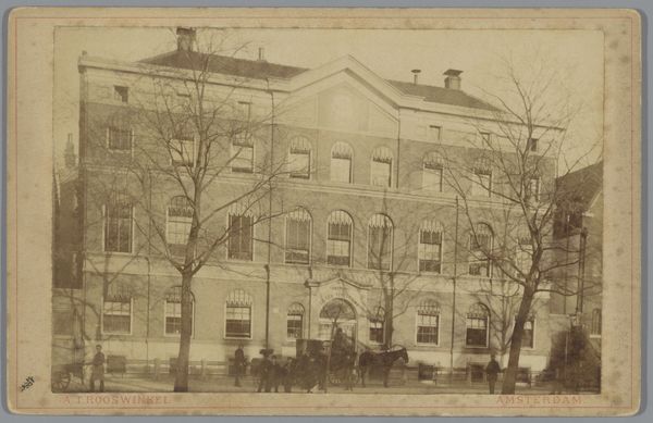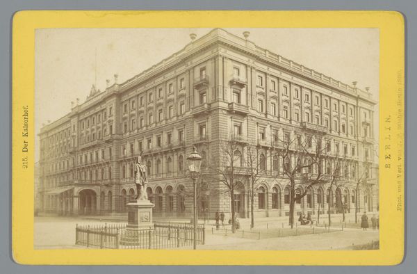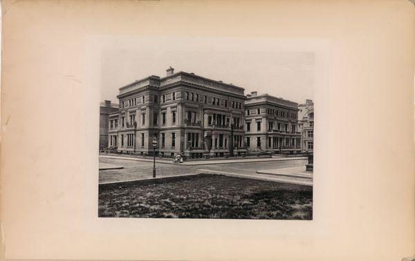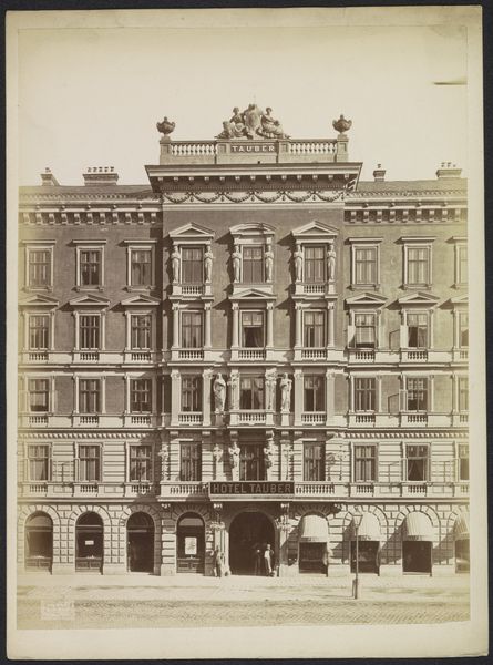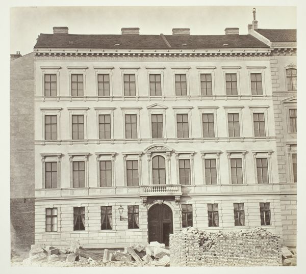 Curator: Here we have a photograph dating back to the 1860s, titled "Kolowrat-Ring No. 3, Haus der Gesellschaft 'Anker'". The location is key, isn't it? This photograph offers us a peek into urban life from over a century and a half ago. Editor: The imposing façade really strikes me. It's almost melancholic; all those closed shutters suggest a story untold. A kind of stoic grandeur hangs about it, wouldn’t you say? Curator: Absolutely. It was taken anonymously but look at this specific angle, how the building dominates. Given the social context of Vienna then—a hub of burgeoning industrialization and changing class dynamics—this building, the "Anker" society house, becomes a symbol. Were people living there or just working there, what kind of meetings, what activities took place there? I want to know more about it, like so many things from that period. Editor: Symbolism definitely leaps out. Architecture often echoes societal aspirations. The regimented windows and ornamentation maybe suggests stability, order, the prevailing values of the time. Do you notice how only a couple of the windows on the right are open, perhaps hinting at hidden life inside this stone fortress? It is all quite suggestive. Curator: Interesting perspective! Perhaps those open windows offer a hint of accessibility within this structured environment, maybe signaling societal openness despite the physical barriers suggested by its structure. I would venture to see this as the transition from a late feudal system towards a more urban bourgeois identity reflected in this stone. Editor: Ultimately, the photograph preserves an impression, of transition, you said. Its austere appearance, immortalized through this photograph, remains with us. It allows our minds to imagine past human lives. Curator: Indeed. This work really illustrates the potency of imagery in visualizing socioeconomic structures. These visual artifacts allow us to grasp how life in these changing cities was structured and functioned.