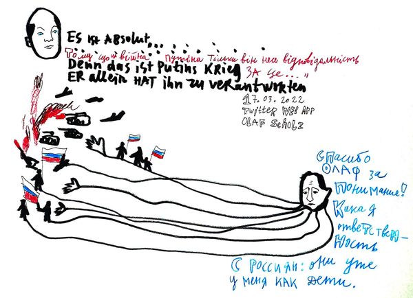 Editor: We’re looking at Alevtyna Kakhidze's “Untitled” drawing from 2022, created with pen and ink on paper. It’s filled with figures and text, almost like a political cartoon. What do you see in this piece, considering its context? Curator: It's impossible to ignore the work's strong socio-political undertones, especially given the date. Kakhidze, being a Ukrainian artist, directly addresses the collective culpability of Russian citizens in the ongoing conflict. How does the artist visualize the connection between individual actions and larger geopolitical events? Editor: I see figures labelled as 'The Artist,' 'The Comedian,' ‘The Singer,’ each seemingly contributing in some way. There's a vertical scale on the side… maybe indicating a level of responsibility? Curator: Exactly. The "degree of fault" seems to be a central theme here. It raises a critical question about individual responsibility within oppressive regimes. Note how national symbols are interspersed: where are the colours of the Russian flag deployed and in what circumstances? What does it tell you about their individual levels of responsibility, or perhaps about different modes of implication? Editor: The Russian flag colours appear on the shoes of a seated man and draped on someone lying down. It gives me a sense of being weighed down or implicated despite perhaps seeming passive. Curator: Precisely. The drawing highlights the complexity of complicity. The style itself, almost childlike in its simplicity, juxtaposes the gravity of the subject matter. Doesn't the direct, unpolished line work force a confrontation with uncomfortable truths? It leaves no room for escapism. What implications do identity politics have in understanding artworks such as this? Editor: It’s eye-opening. The artist compels viewers to question power structures, identity and accountability in times of crisis. Thank you. Curator: It highlights the important role of art in voicing concerns of global socio-political matters and reflecting on collective consciousness during crises. A stark visual representation of a painful reality.