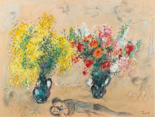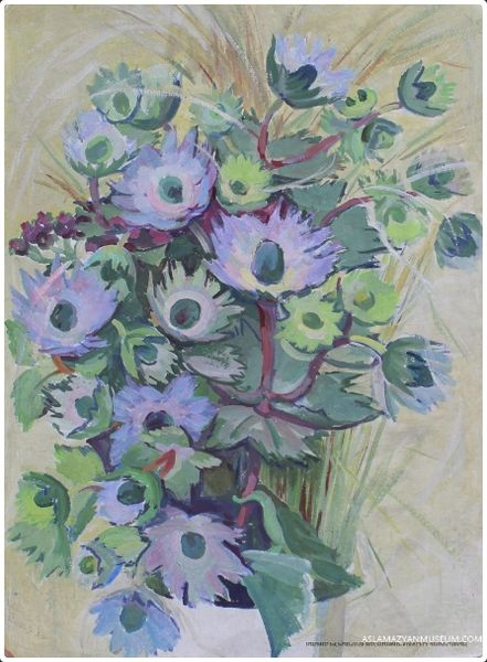 Adalbert Erdeli painted "Summer" with oil on canvas, creating a vibrant, textured surface of floral abundance. The energetic brushstrokes and contrasting colors might evoke the warmth and vitality of a summer garden. Observe how Erdeli uses blocks of color to define forms. The flowers and leaves are rendered with thick, visible strokes, giving the painting a tactile quality. Note the interplay between light and shadow. The background is a wash of yellow and pale blue, suggesting sunlight filtering through the foliage, while the darker greens and blues in the foreground create depth and dimension. Erdeli’s structural approach to the composition is evident in how he organizes the elements, focusing on capturing the essence of natural forms. Through color and brushstroke, "Summer" invites us to consider the relationship between representation and abstraction and how the visible structure of a painting creates meaning.