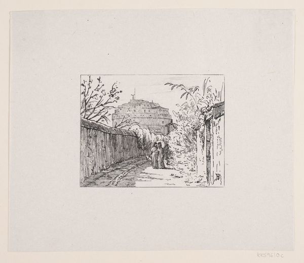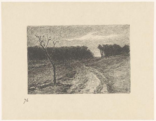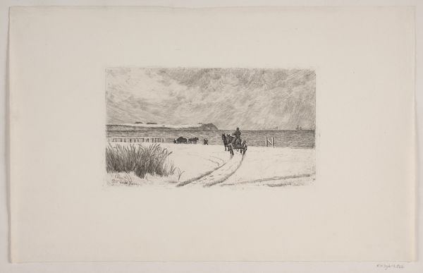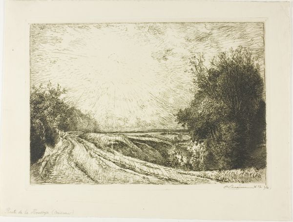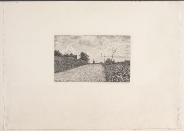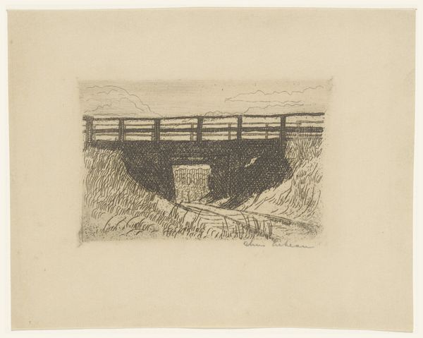Curator: This is “Landschap met kanaal” by Cino Bozzetti. Created sometime between 1886 and 1949, it’s an etching printed on paper. Editor: It’s rather somber, wouldn’t you say? The limited palette and stark lines create a rather desolate feel. It also appears quite small and intimate in scale, pulling the viewer into a space that feels very private and a little remote. Curator: Note the meticulous use of line to delineate form and texture, particularly in the vegetation along the canal banks. See how Bozzetti varies the density of the marks to create tonal gradations? It’s all about structure, using minimal means to articulate space and form. Editor: But what of the societal implications? We must consider the political dimensions of landscape art in representing land ownership, exploitation, and perhaps even ecological concerns of that specific place during Bozzetti’s lifetime. The somber mood is likely intentional given its creation date between two great wars. I bet this evokes themes of loss. Curator: I see your point, but let’s focus on what is visible in the image. It offers an almost mathematical dissection of nature, with its precisely ruled lines contrasting with more organically rendered vegetation. This gives insight into Bozzetti’s formal process and conceptual interests. Editor: Formal process and conceptual interests are never disconnected from larger cultural movements or material conditions. We must acknowledge this depiction may reflect an emotional state resulting from broader circumstances involving both land and its use. Bozzetti surely lived with these realities whether explicitly shown here or simply felt. Curator: You bring an interesting point about emotional subtexts potentially embedded in the composition. Editor: Ultimately, analyzing art requires multifaceted consideration encompassing intrinsic form and its exterior circumstances. It enriches understanding! Curator: Indeed, balancing meticulous analysis of form and material with contextual narratives unlocks more perceptive insight overall.