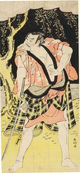 Curator: This woodblock print from the Harvard Art Museums depicts the actor Otani Hiroji the Third in the role of a servant. Editor: The immediate impression is of imbalance. The figure strains forward, yet the composition feels static due to the flatness of the plane. Curator: That tension is key. The actor plays a servant, a figure of lower status, yet the forceful pose hints at suppressed power. The costume, too, is fascinating, juxtaposing the coarse plaid with the actor's bare torso. Editor: The color palette feels deliberately restrained. The limited range of hues—muted greens, browns, and oranges—contributes to the mood of underlying intensity. Curator: Precisely. Even the single line of the eye speaks volumes about the character's inner life. Editor: I see it now, the visual austerity amplifying the actor's expression. Curator: It's remarkable how ShunkÅ captures not just a likeness, but a cultural memory of social roles. Editor: A powerful study in form and symbolic expression, indeed.