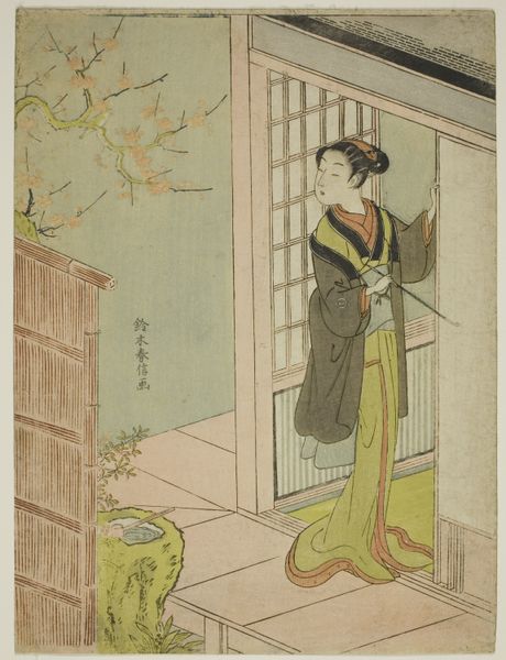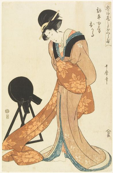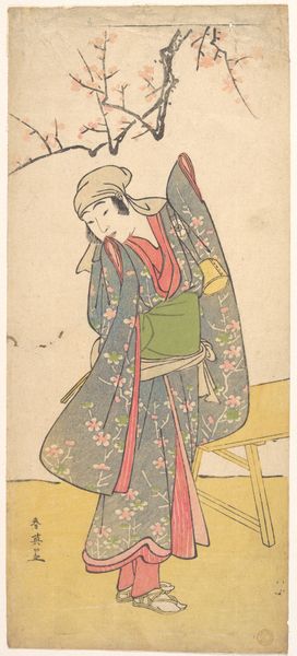 Editor: Here we have Katsukawa Shunko's woodblock print from 1785, titled "The Actor Osagawa Tsuneyo II, Possibly as Misao Gozen." The muted colors give it a calm, almost melancholic feel, even though it's portraying an actor in a theatrical role. What social commentary, if any, can we gather from such an artwork? Curator: That melancholic feel is precisely where the work finds its strength, placing the *on'nagata*, male actors who perform female roles, in conversation with broader themes of identity. Here we see not just a portrait but a complex negotiation of gender and performance. These prints gained popularity during a time when the Tokugawa shogunate was enforcing strict sumptuary laws aimed at regulating social behavior and appearance. Editor: So the prints become a form of…resistance? Curator: Exactly! By depicting actors, who were already liminal figures within society, artists like Shunko offered a subversive commentary on those very restrictions. Consider the role of Misao Gozen. Often portrayed as virtuous and self-sacrificing. To see a male actor in that role, captured in a print, is to question the rigidity of societal expectations about gender. This is also happening during a rise in mercantile economy and, subsequently, an elevation of Kabuki alongside. Does the placement within a theater impact how you read the figure? Editor: I see! It makes the print not just an image but a form of social commentary on performance. What a powerful message! Curator: Precisely, thinking about performative representation, and how it questions fixed societal positions lets us rethink what "the traditional" truly means!
