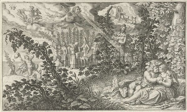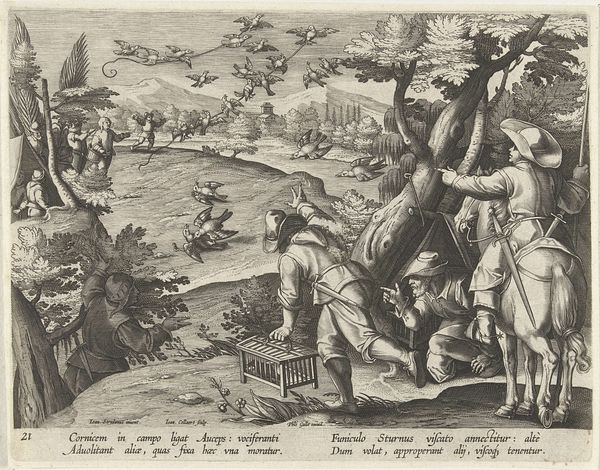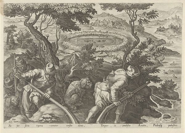 Curator: This is Jan Collaert the Younger’s "Hunter Trapped in a Pit," made between 1594 and 1598, an engraving currently housed at the Rijksmuseum. It is striking, isn’t it? My initial feeling is one of intense vulnerability and entrapment. Editor: Absolutely. The layering of the engraving – you can almost feel the density of the foliage, the earthiness of the pit itself. Consider the actual process: Collaert, most likely through an intermediary draftsman, took ink to paper to record or conceive this elaborate scenario of man undone. And what paper would he have used? Did he select it himself? Curator: I’m drawn more to the visual narrative, to how Collaert uses recognizable symbols. We have the obvious figures: the hunter fallen into the pit, being threatened by serpents – traditionally associated with danger, temptation, or even deception. Above, other hunters are desperately trying to pull him to safety. Editor: The landscape also merits our attention. It's hardly naturalistic. It feels composed, almost like a stage set, and yet that artifice is key. This mannerist artificiality highlights the constructed nature of the image itself. Collaert made many prints like this: the mass reproducibility allows these prints to disseminate ideas far and wide at this historical moment. It also democratized images! Curator: I find the classical ruins behind them fascinating. They speak to a history of collapse and decay. Could they symbolize the fragility of human endeavor? The hunter’s pride leading to his downfall? Editor: I wonder too, what sort of collaborative workshops were common for a prolific print-maker like Collaert. The scale of his practice begs questions of division of labor, of hierarchies of craft. Curator: It's a poignant reflection on the precariousness of life and how even the skilled can fall prey to unseen dangers. This piece carries significant emotional weight, the engraving captures both the physical struggle and psychological torment. Editor: Precisely. Looking closely at its creation allows us to reflect not only on its message but also on the means through which this image reached its audiences centuries ago.