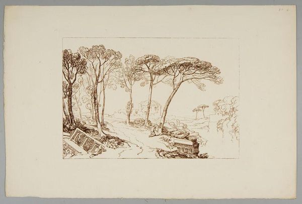 Eugène Cicéri designed this stage set with watercolor and graphite on paper. The design presents us with a sequence of trees against a pale sky, each rendered with subtle gradations of color that convey depth and volume. Cicéri masterfully employs line and shading to articulate the texture of the bark and the density of the foliage, creating a compelling illusion of three-dimensionality on a two-dimensional surface. The composition's structure is a delicate balance between naturalism and artifice. The ordered placement of the trees and the calculated recession into space suggest an underlying formal rigor that belies the apparent spontaneity of the watercolor medium. We might consider how the work destabilizes established meanings by blending the boundaries between nature and design, inviting reflection on representation and perception in the theater. The artist challenges us to think about space and representation. Notice how the structured arrangement of the trees and the intentional handling of the material serve to reinforce its status as a work of artifice, inviting ongoing interpretation.