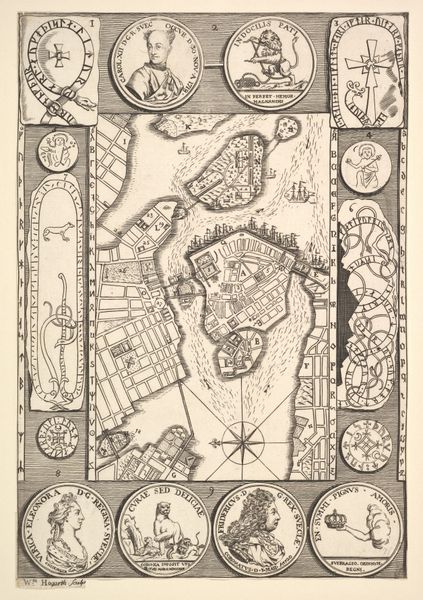 Editor: So, this is "Kaart van de Slaperdijk (vierde deel)," a drawing made with ink and engraving by Caspar Specht in 1705. It looks like a section of a much larger map. I find the density of the lines and geometric shapes oddly compelling. How do you approach interpreting a piece like this? Curator: Initially, I look at the composition. Observe the division of space; note the hierarchy created through scale and placement. How does the artist use line—the crispness of the engraved lines versus the freer, more gestural ink work, perhaps indicating different functions, like established boundaries versus less defined areas? Editor: That’s interesting, I hadn’t thought about the contrast in the line work so much. Are you suggesting that it might show areas more or less controlled? Curator: It invites the question. Also, note the repetition of motifs – the coats of arms, the stylized trees, the compass rose. These recurring visual elements establish a rhythm, a structural framework within the image. What sort of system or program could these devices suggest for the viewer? Editor: Perhaps it's suggesting power, through repeated emblems? A constant visual reminder? It's more than just a map; it's a statement. Curator: Precisely. The aesthetic choices always serve a function. The relationship between form and content in a work like this is really sophisticated. How do you see this piece differently now? Editor: Now I'm seeing beyond just the representation, noticing how the arrangement and visual language itself contribute to the meaning. Thanks for that formalist perspective.