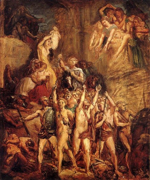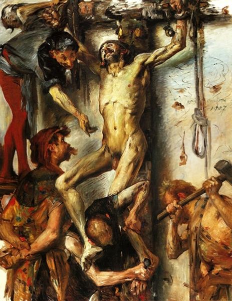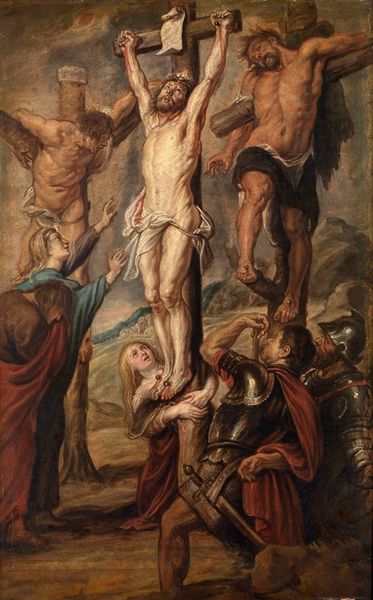 Editor: Max Oppenheimer’s "Condemnation," created in 1913 using oil paint, presents a chaotic scene. The raw brushstrokes and somber tones really emphasize the physical struggle that seems to be happening. How do you interpret the relationship between the materials used and the themes explored in this painting? Curator: It’s crucial to consider the materials first: oil paint. Its accessibility during this period meant art production became increasingly democratized, though debates still raged about who had access to ‘legitimate’ artistic training and spaces. Look at how Oppenheimer deploys it – the thickness, the texture. He’s not just depicting figures, he’s enacting a kind of brutality with the paint itself. It becomes a material manifestation of the act of condemnation. Editor: That makes sense. So, the value of the artwork isn’t just in its visual representation, but also in understanding the labor and material conditions that went into making it? Curator: Precisely! Think about where Oppenheimer sourced his materials, his studio space. Who were his patrons? These are all material factors that impact how we read this painting. The ‘condemnation’ isn’t just of the figure depicted, but perhaps a critique of the society and economic forces at play in 1913 that led to such…visceral displays of power? What sort of social condemnation did artists face if they weren't making "acceptable" art at the time? Editor: I hadn’t considered it that way. So, by focusing on the materiality and the process, we can start to unpack larger social commentaries that the artwork may be making? Curator: Exactly! It pushes us to see beyond the surface and to question the relationships between art, labor, and societal structures. Editor: Thanks, this has totally changed how I look at "Condemnation." I'm much more aware of the artwork as a product of specific conditions of labor. Curator: My pleasure! And always remember to consider art as both an object *and* a process embedded in its unique cultural time.