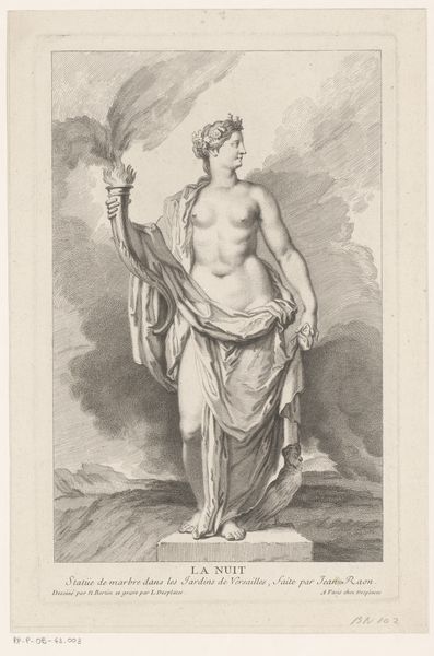 Editor: Here we have a print from 1782, "Lucretia seated, half naked, stabbing herself…" made with engraving, maybe charcoal drawing too and it’s held at the Met in New York. It looks…well, dramatic. All that stark shading makes it almost theatrical. What stands out to you in this piece? Curator: What strikes me is the reproduction of Pellegrini's original scene via engraving, a mechanized process for wider dissemination. Consider the social context: an image of female virtue and sacrifice, made accessible to a burgeoning middle class through mass production. Who was consuming this image and how did that consumption affect the way people thought about labor or access to luxury materials or class differences in the eighteenth century? Editor: So you're saying the print isn't just about Lucretia’s story, but also the story of how people gained access to art? It's about who *could* own it? Curator: Precisely. Engravings like these democratized access to imagery. And consider the implications of turning something like painting, done by hand, to the mechanical arts of the printing press and repeatable copies. These images, which once might be accessible only to the wealthy, can now furnish moral lessons and aesthetic pleasure across different segments of society. What's gained, and lost, in this transition from a unique artwork to a printed copy? Editor: I never thought of it that way – about who has access to create it, who reproduces it, who then owns it... fascinating to examine it from that manufacturing aspect. Thanks! Curator: My pleasure. It always brings up new points of reflection and shows how many doors there are into examining the social contexts around the consumption of fine art and labor conditions of printing it, at the time!