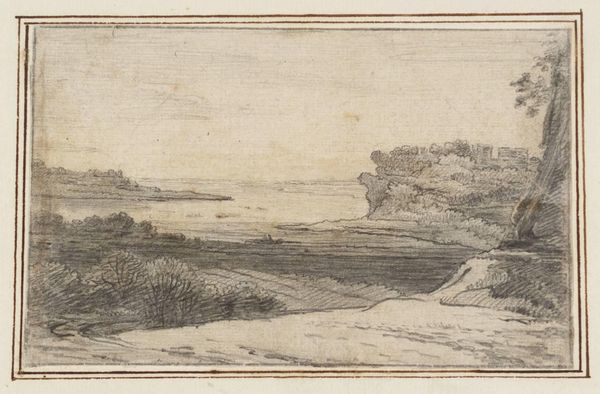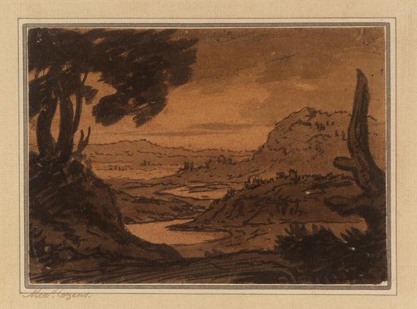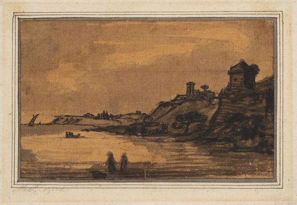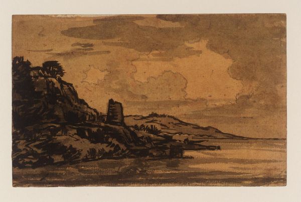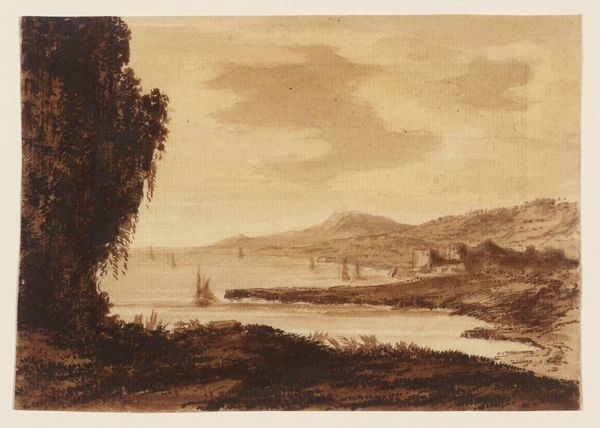 Curator: Alexander Cozens' work, "A Wooded Coast, a Ship in the Distance to the Right", presents a captivating study in monochrome, currently held at the Tate Collections. Its modest dimensions offer an intimate viewing experience. Editor: It feels like a sepia dream, doesn't it? A fleeting memory of a coastline, all soft edges and hazy horizons. There's a melancholy to it, almost like a landscape fading into time. Curator: Indeed, the tonality creates a sense of unified atmospheric perspective. The composition emphasizes a structured layering of space, moving from the detailed foreground to the indistinct horizon line, subtly punctuated by the ship. Editor: That little ship—it's easy to miss. It makes me wonder about journeys, departures. The blurred trees on the bank feel like they are waving goodbye. I can almost smell the sea air. Curator: The artist's emphasis on formal elements directs our attention to the arrangement of forms, the interplay of light and shadow. Perhaps that evokes the sensation of standing there, more than any literal depiction. Editor: Exactly! It's less about what's there and more about how it feels to be there. For me, it is a gentle reminder of nature's transience.