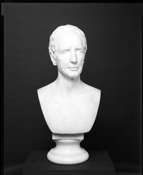 Curator: Here we have a marble bust of Thomas Cole, sculpted around 1850 by Henry Kirke Brown, an exemplar of American Neoclassical sculpture now residing here at the Met. Editor: It’s startling. Such stillness rendered in stone—it’s like capturing a breath that never leaves. And those eyes... unsettlingly placid, almost godlike in their detachment. Curator: The materiality speaks volumes. Marble was highly prized. And think about the physical labor: the quarrying, the carving. It positions Cole within a lineage of respected figures deemed worthy of this demanding process. The folds of his draped fabric suggest an attempt to evoke a classical Greek statue. Editor: Right. That drape feels so intentional, doesn’t it? Less like everyday attire, more like... well, theatrical costuming. It is funny because, in contrast, Cole’s actual features—that determined brow, the almost severe line of his mouth—feel incredibly modern. A compelling tension there, an old-world aspiration clashing with the undeniable sharpness of his presence. Curator: It underscores Cole’s ambition and legacy. Sculpting was a craft, so it would not be something everyone could just engage in freely. Commissioning it signifies economic power, yes, but also the social value attached to art, specifically his own. To me, the real subject is really about the power structure of 19th-century artistic production. Editor: Yes, it could be the perfect symbol to introduce visitors to the concept of artistic labour and commodity production. And speaking of production, think of Brown chipping away at cold, hard stone to humanize his subject, how arduous, literally grounding. You've captured his spirit and rendered the artist himself timeless. I imagine Brown felt some pressure to fulfill that task for Cole. Curator: Precisely. His own standing as a lauded painter solidified his position. Editor: So it's all tied together! Labor, value, legacy... Quite the package neatly chiseled in marble. Thanks for bringing that into the light. Curator: Indeed. It's amazing how art's production reflects its social significance.