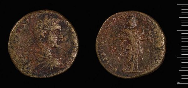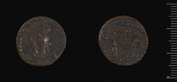 Curator: This coin, a follis of Galerius from Alexandria, presents a fascinating glimpse into the visual rhetoric of imperial power. Its materiality speaks volumes. Editor: It looks so worn, like it has traveled through centuries of pockets and purses, carrying the weight of Roman power. Curator: Exactly. Minted during a period of significant political restructuring, the coin depicts Galerius, highlighting his authority within the Tetrarchy. How interesting that coinage was used to enforce a kind of political messaging! Editor: The imagery, then, serves a propagandistic function? One side shows Galerius's profile, while the other seems to portray a standing figure. Curator: Indeed. The standing figure may be a representation of a deity or perhaps another symbol of imperial authority. Consider how these images legitimized Galerius's rule within a diverse empire. Editor: It’s compelling to think about how this small object connected diverse populations through a shared visual language of power and belief. It really makes me wonder what messages we are putting into our own currency today. Curator: Absolutely, it prompts us to reflect on the legacies of power and representation that continue to shape our world. Editor: A tiny window into an empire, and a mirror for our own times.