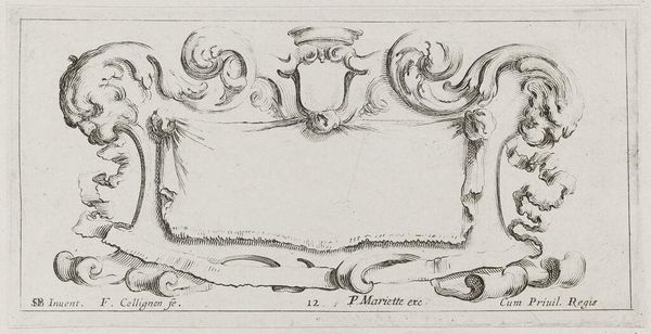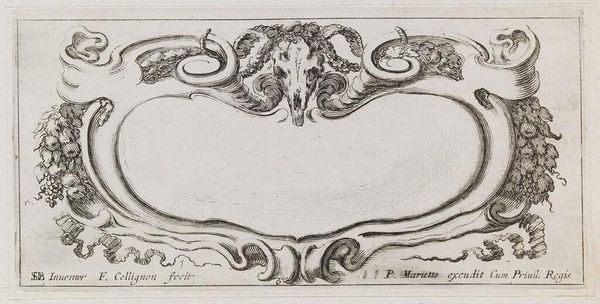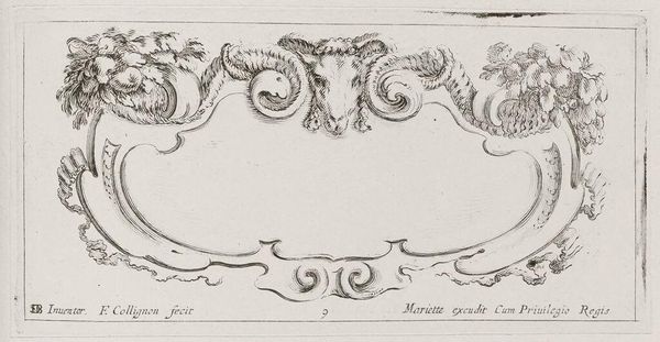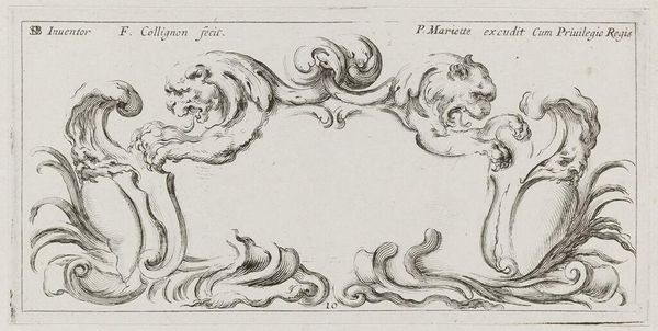 Curator: This is "Cartouches," an engraving by François Collignon. The dimensions are relatively modest. What's your first take? Editor: It feels almost playful, but with a hint of underlying tension. The cherubs seem to be struggling with something. Curator: The cherubs and animal heads are strategically placed, framing what would typically be a space for text or a coat of arms. The lines are meticulous, indicative of the printmaking process. Editor: Right, the blank cartouche invites questions about power, the relationship between the monarchy and its representations, and the labor that goes into constructing those images. Curator: It's a fascinating example of how even seemingly decorative elements can carry complex social and political weight. Editor: Indeed. It's a reminder that what's left unsaid can be just as powerful as what's explicitly stated. Curator: I find myself drawn to the craftsmanship and the artist's hand in shaping these materials. Editor: For me, it's about what this piece tells us about the era's values and power dynamics.