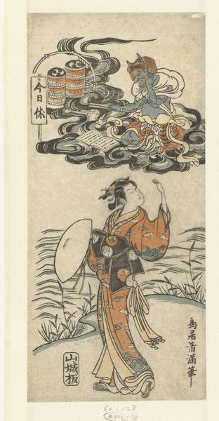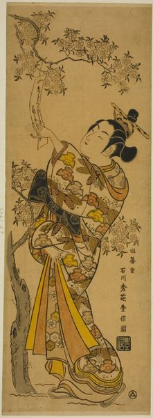 Editor: This is "ChÅfu Jewel River, a Famous Place in Musashi Province" by Suzuki Harunobu. It's a woodblock print, seemingly depicting a mother and child. What strikes me is the intimacy and the everyday nature of the scene. What do you see in this piece? Curator: I see a carefully constructed image, seemingly domestic. Yet, it resonates with layered societal meanings. The act of crossing the river can symbolize the transitions women undergo. Are they truly free or are they confined by traditional roles, even within these intimate moments? Editor: That's a different way of looking at it than I imagined! It gives me a lot to think about. Curator: Indeed. Art is rarely just what it seems on the surface. This image invites us to consider the complexities of gender and societal expectations. Editor: Thanks for sharing those insights! Curator: My pleasure.