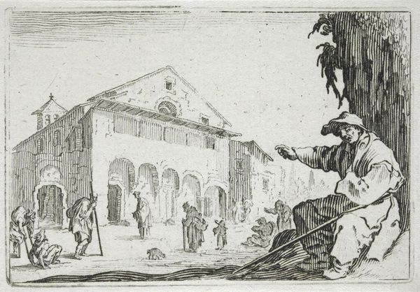 Editor: Here we have Jacques Callot's etching, "Man Seated Before a Hospice." The detail in such a small work is incredible! What strikes me is the contrast between the seated figure and the hospice itself. What stands out to you? Curator: As a materialist, I'm drawn to the etching process itself. Consider the labor involved in creating such intricate lines with acid on a copper plate, then the mass production this technique allows. How does that influence its value compared to, say, a unique painting? Editor: That's a good point! The reproducibility definitely changes how we think about value. I hadn't considered that. Curator: Exactly. And the hospice, as a site of care, becomes a commodity, replicated and distributed. It challenges the perception of both art and social welfare. Editor: So, the value isn't just in the image, but in the social commentary and the means of its production? Thanks, I'll never look at etchings the same way! Curator: Precisely. Thinking about the material and social context opens up a whole new way to appreciate art.