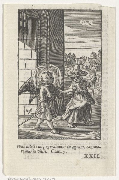 This is a woodcut by Christoffel van Sichem the Younger, where an angel guides a child dressed as a pilgrim. Note the angel, a visual messenger, emanating divine light. This symbol transcends cultures, reappearing across time, from ancient Greek depictions of Iris to Renaissance annunciations. Here, the angel leads the child, a figure draped in the garb of pilgrimage—a journey, both literal and metaphorical, toward enlightenment. The pilgrim’s staff, an ancient symbol of travel and support, echoes in the caduceus of Hermes or Mercury, guiding souls. The pilgrimage, a motif found across religions, embodies a quest for meaning. The image engages us on a subconscious level, tapping into collective memories of journeys, struggles, and the search for higher truths. The angel, a recurring messenger in art, suggests that guidance and comfort are available on our own life’s path. As we continue, reflect on how these symbols resonate within you, echoing through the corridors of time.