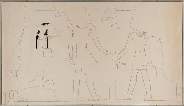 Editor: So, this is an untitled watercolor work by Marcel Dzama. It presents figures who appear both human and… something else. There's almost a theatrical feeling to it, but also a kind of unsettling stillness. What strikes you most about this piece? Curator: I'm interested in how Dzama uses these figures to explore themes of identity and performance. The blend of human and non-human elements can be seen as a commentary on societal roles, perhaps even a critique of power structures. What does this hybridity suggest to you about conformity versus individuality? Editor: I hadn't considered the power dynamics. It's interesting how the "tree-headed" figures are also the ones in formal attire. I'll definitely be thinking about this one differently now. Curator: Exactly! And how does this reading shift when we consider Dzama's background and influences, engaging with Dada and Surrealism? It's about constantly questioning what we see, and how societal expectations shape our perceptions.