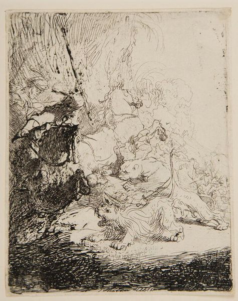 Editor: We’re looking at "A Small Lion Hunt with a Lioness," an etching by Rembrandt van Rijn from 1641. It's striking how dynamic the composition is, even in this small scale. The layering of lines creates a sense of movement and chaos. How do you interpret this work? Curator: The etching presents a fascinating study in the relationship between form and content. Observe how Rembrandt uses contrasting densities of line. The left side is almost aggressively dense, whereas on the right, it disperses, loses density. How do these lines contribute to the overall narrative? Editor: It almost feels like the action is originating on the left and dissipating toward the right. The figures on the left are clearly defined, dark, while the lioness on the right almost dissolves into the background. Curator: Precisely. The interplay of light and shadow, created by varying line densities, directs the viewer’s eye. Consider also the use of negative space. The empty areas on the right are not merely voids; they activate the surrounding lines, intensifying the sense of depth and drama. How does this compare to his other works? Editor: That’s a good point. Compared to some of his portraits with a single strong focal point, this feels much more diffuse, relying on these gradations of tone to create focus and interest. It's like the lines themselves are performing the hunt. Curator: Indeed. Rembrandt is not just depicting a hunt, he’s using the formal elements of etching to convey the energy and dynamism of the hunt itself. Note, too, the lack of detail in the background, relative to the foreground, adding another level of dimensionality. It demonstrates masterful command over the medium. Editor: I see what you mean. By focusing on these intrinsic elements – line, tone, and composition – we can appreciate the way the print powerfully conveys both the subject and feeling of "A Small Lion Hunt." Curator: And further appreciate the ways he uses light, or rather the absence of ink, to define shape and meaning, making negative space as potent as the etched lines themselves.
