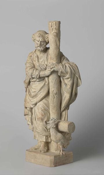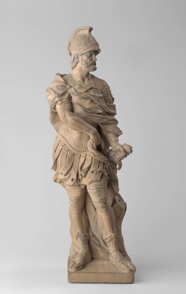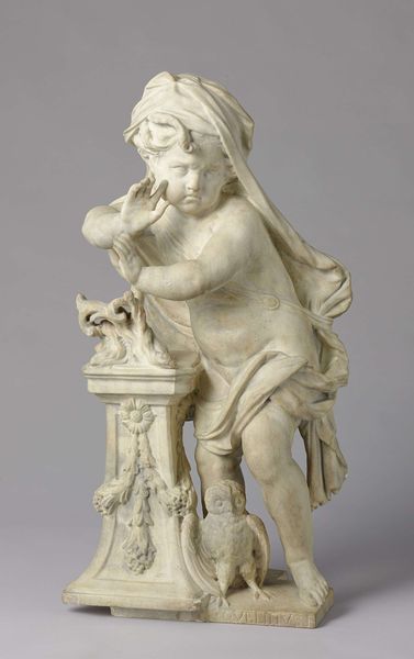 This is "Fragment van de Oranjeboom," a plaster artwork made by Frans Stracké. The sculpture is a study in contrasts: the smooth, idealized form of the male figure against the rougher textures of the drapery and fish-like base. Notice how the artist uses the play of light and shadow to define the musculature and create a sense of three-dimensionality. The figure’s relaxed pose is juxtaposed with the formal elements of classical sculpture, creating a dynamic tension. Stracké's choice of plaster as a medium invites us to consider the artwork's materiality, where it can be seen as a study in form rather than a definitive statement. This piece engages with classical ideals while simultaneously questioning the monumentality traditionally associated with sculpture. Consider how the fragment challenges fixed meanings. It represents a shift towards embracing incompleteness, highlighting the creative process and opening up possibilities for interpretation.