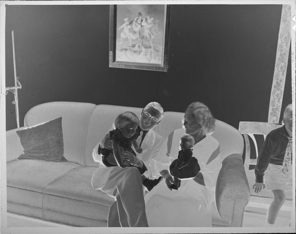 Curator: This photograph, currently titled *Untitled (men and women at party)*, was created by Lucian and Mary Brown, and it resides here at the Harvard Art Museums. Editor: My first impression is of an eerie elegance; the reversed tones lend a ghostly quality to the figures and the social gathering. Curator: Indeed, the tonality is striking. Note how the composition is arranged, with the stark juxtaposition of light and shadow guiding the eye through the layers of social interaction. Editor: It's fascinating to consider this scene as a document of social rituals. The attire, the decor, the implicit power dynamics—it all speaks volumes about the context of this gathering. Curator: And what about the interplay of textures? The smooth surfaces of the furniture against the floral arrangements overhead, all contribute to the image's complex aesthetic. Editor: The image prompts us to think about social settings and the roles we adopt within them. What kind of party is this? Who are these people and what are they talking about? Curator: Precisely, the arrangement makes us see social gatherings as a stage with players who perform the roles dictated by convention. Editor: I find myself dwelling on the contrasts within the composition. The interplay of shadow and light is interesting. Curator: It is a compelling piece that offers a rich ground for analyzing photographic form.