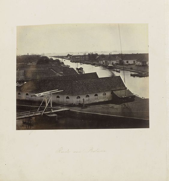Curator: This photomontage, created between 1865 and 1870 by Woodbury & Page, captures a serene, yet ordered cityscape known as Havenkanaal en de Boom te Batavia. Editor: It strikes me immediately as a very rigid, almost sterile depiction of what should be a lively port. The tones are muted, the composition highly structured—it feels emotionally quite distant. Curator: The technical aspect is intriguing. Observe how they have painstakingly assembled separate photographic negatives. Notice the detail afforded to linear perspective as it is created using high vantage points. Semiotically, it demonstrates both precision and the limits of photographic technology at that time. Editor: Yet, that precision belies a deeper narrative of colonial power. Batavia, now Jakarta, was at the heart of the Dutch East Indies. This "order" isn't natural—it’s imposed. We must remember the forced labor, the exploitation required to build and maintain such infrastructures. Even the calm waters suggest control. Who profits from this calm? Who suffers? Curator: I agree that one must read the work contextually; however, consider the very materiality. It’s albumen print on cardboard, a delicate medium. The formal constraints shaped the aesthetic choices just as the cultural circumstances did. Editor: The medium amplifies the historical distance, doesn't it? But I find it vital to recognize the visual markers of occupation—the regimented buildings, the implication of shipping lanes geared toward resource extraction—and read them as evidence of a structure violence enacted against the people and place. Curator: The photographic perspective privileges a particular visual ordering that requires careful critical reflection, and that also reveals certain elements about this historic landscape through unique techniques. Editor: Precisely! It urges us to recognize the colonial gaze embedded within the photographic act, asking critical questions about whose stories are omitted and why that is so. I encourage the listeners to dwell on that colonial gaze. Curator: Reflecting on the photograph’s formal structure and composition enriches and deepens an informed sense of both social reality and material production in 19th century colonial Indonesia. Editor: For me, examining "Havenkanaal en de Boom te Batavia" provokes a discussion about not only representing the past but actively decolonizing our ways of seeing. It prompts essential questions about equity, history, and ethics within and outside of the museum.