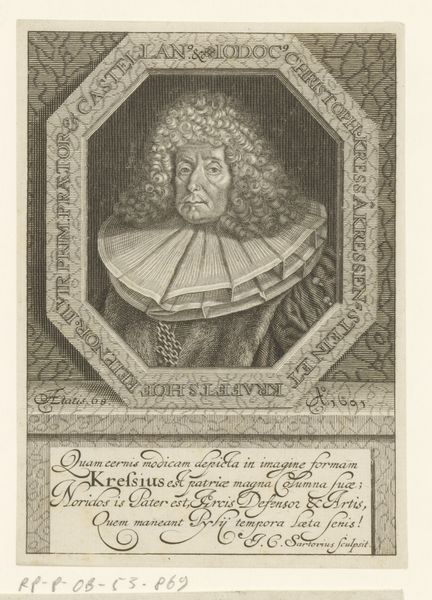Curator: So, this print is "Portret van Conrad Mel" by Johann Benjamin Brühl, made sometime between 1705 and 1763. It's currently held at the Rijksmuseum. The engraving itself, rendered with such clear lines, gives the sitter a formidable presence. What strikes you initially about this portrait? Editor: I find myself thinking about the repetitive labor that must have gone into this work. All those fine lines...what do you make of the material reality of a print like this in the 18th century? Curator: Exactly. Think about the copperplate, the tools, the repetitive actions required to create those uniform lines. How does this relate to the function of a print like this in society? Editor: Well, presumably it would allow for fairly wide distribution of his image, allowing access to portraits for people who couldn't commission painted portraits. Curator: Precisely! The reproducibility is key, impacting viewership and consumption of images. We need to also consider the socio-economic context surrounding its production. Who was Conrad Mel, and what does his portrayal within this stylized framework tell us about societal values at the time? Consider, too, the role of printmakers like Brühl: were they seen as artists or artisans? How does the "original" even exist, and is that even important given the wide distribution? Editor: The question of the original and the copy, the art versus the craft, really reframes how we should appreciate prints such as this one. It’s not just about aesthetics but about production, distribution, and labor. Curator: Absolutely. We start to see the intricate network of production and how it influenced not just art but broader society. Focusing on process and materials demystifies the artwork and connects it to the lived experiences of the people who made it. Editor: It completely transforms the way I understand the print. I will always see that repetitive, laborious act. Curator: Me too. Thinking materially connects art to history.