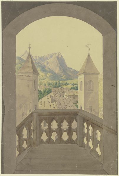 Editor: This watercolor by Hector von Günderrode, "Old Houses and a Tower," presents a cityscape in soft, muted tones. There's a dreamlike quality to it; the buildings almost seem to breathe. What visual stories do you think this artwork holds? Curator: The tower, ever-present and looming, anchors the scene to the past. It’s not just architecture; it's a sentinel, a visual memory. Notice how its height dwarfs the figures below; a subtle indication of power, perhaps religious or civic. The artist uses this contrast to explore the relationship between humanity and enduring structures of authority. Do you see a specific emotional tone embedded within that contrast? Editor: I think there's a sense of timelessness but also, a kind of quiet constraint – almost like the figures are aware of their smallness in comparison to history. The colors are quite muted, maybe creating that sense of things fading into memory. Curator: Exactly. Color and form communicate so much! The subdued palette creates a feeling of looking at a memory, a fragment of time. This recalls similar visual strategies found across cultural art traditions used to convey age and reverence through particular color scales. It could signify acceptance of tradition and societal structures...or, given the era of the artist, possibly hint toward a yearning for a different reality. Do you observe any other pictorial devices which might signify themes from history or from psychology? Editor: The buildings themselves seem almost personified, especially with those dormer windows like eyes looking out from the roofs. And the figures seem somewhat withdrawn. Curator: Indeed! That visual anthropomorphism links human and structural identity. Consider also the placement of the figures in relationship to the building in the foreground, possibly alluding to narrative from fairy tales or medieval legends where humans meet structural authority such as "giants" and other mythical entities, which are ultimately challenged or overthrown. So what final thoughts arise when pondering about the relation of the image's "icons?" Editor: It's like a frozen moment from a story where history and individual lives are subtly interwoven. Fascinating how a simple cityscape can evoke such complex themes. Curator: Absolutely. Pictorial structure reveals profound emotional and societal dynamics; visual art serves as the greatest witness!