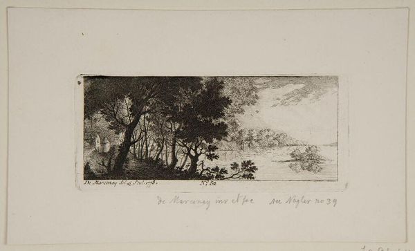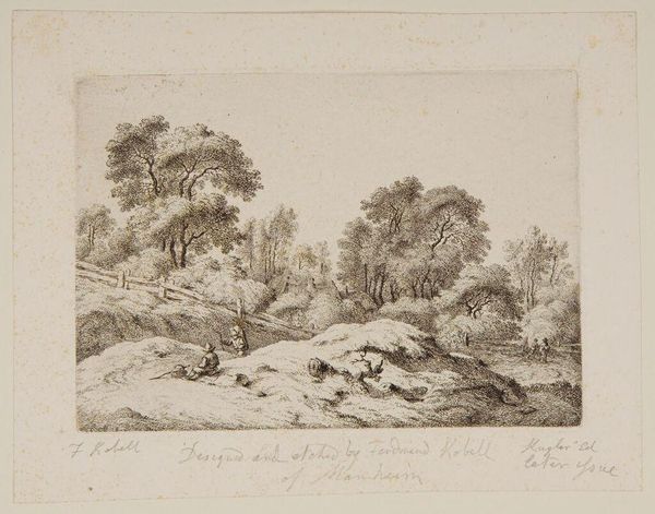 Editor: This is "The Travellers" by Antoine de Marcenay de Ghuy. It's a small print, and the landscape feels so serene and composed. What stands out to you in terms of its formal qualities? Curator: Observe how the artist employs varied densities of hatching to articulate form and space. Note the contrast between the dense foliage and the sparsely rendered mountain. How does this contrast affect your perception of depth? Editor: It pushes the mountain further back, making the travellers the clear focus. Curator: Precisely. The strategic placement of light and shadow directs the eye and structures the composition. Editor: I see it now; the light really sculpts the scene. Thank you! Curator: Indeed. It is a testament to the power of line and tone.