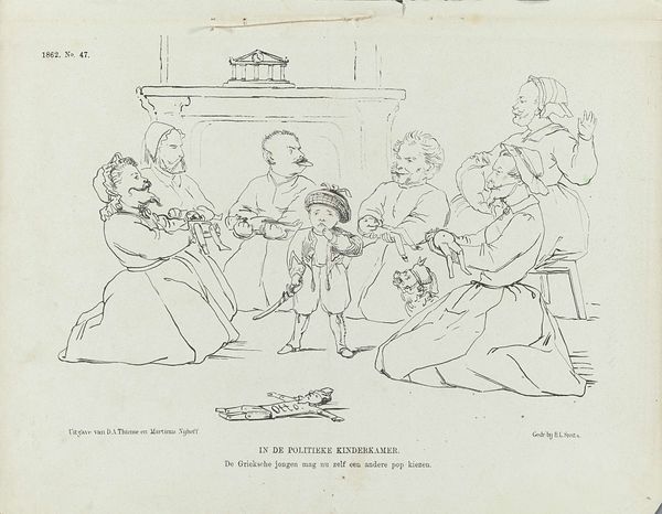 Editor: This is a drawing in pen and ink by J. de Boer, titled "Spotprent op Louis de Potter," created between 1828 and 1830. It looks like a satirical sketch featuring monkeys behaving like humans, with some very direct symbolism happening with petitions, a cat, and a fireplace. It's all quite bizarre! What’s your perspective on this unusual composition? Curator: Indeed. What immediately strikes me is the linearity and the clear separation of forms achieved through the artist’s deliberate use of line. Notice how the varying thickness and weight of the lines define each figure and object, creating a dynamic sense of depth. How might you assess the composition itself in terms of balance and the placement of symbolic elements? Editor: It feels intentionally unbalanced! The activity is all clustered on the left, with those scrolls saying “PETITION” sort of fading away on the right. But are the characters caricatures of authority? Curator: Observe the central grouping. We have simian figures engaged in seemingly political and domestic activities. Their gestures, though exaggerated, carry a sense of narrative, further accentuated by the text inscribed at the bottom. The narrative is quite explicit, yet the success lies in de Boer's construction of the composition. The fire may represent revolutionary ardour being stoked and fueled by the actors in front of it. Do you notice how it unifies these disparate simian characters? Editor: I see what you mean. The fire’s almost acting like a stage backdrop for the scene! All the lines lead back to it, even from that monk monkey over on the side, who looks to be reading the petition aloud! Thanks for drawing attention to the structural components of this work that tell its story! Curator: It is in carefully analyzing the interplay between these structural elements that we gain a deeper appreciation.